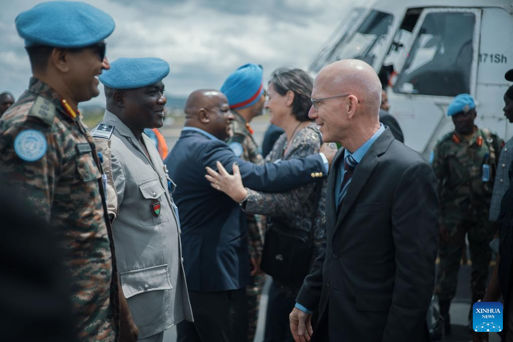 James Swan (R), chef de la mission de maintien de la paix de l’Organisation des Nations Unies (ONU) en République Démocratique du Congo (RDC), également connue sous le nom de MONUSCO, arrive à Goma, en République Démocratique du Congo (RDC), le 24 avril 2026. James Swan a appelé vendredi à un contrôle efficace du cessez-le-feu. (Str/Xinhua)